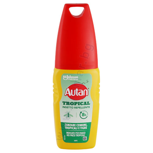 Autan®Тропик–Лосион–Репелент срещу насекоми с дълготрайна защита срещу комари, тигрови комари, хапещи мухи и кърлежи дори при изпотяване и влажни условия. Подходящ е за цялото семейство, пътуващи, спортуващи и други активни хора. Прочетете листовката преди употреба.