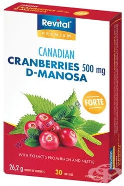 Екстракт от плодовете на канадски боровинки (Vactinium macrocarpon) стандартизиран на 10.0 g боровинки, D - маноза, Витамин С (L-аскорбинова киселина), екстракт от коприва (Urtica dioica), екстракт от листа от бреза (Betula pendula), антислепващи агенти - магнезиев стеарат, капсула: желатин, говежди, оцветител - титанов оксид.