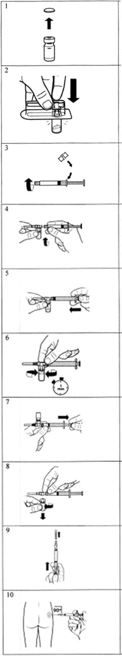 Инжектирайте интрамускулно, като вкарате иглата под ъгъл от 90 градуса в седалищната област. Уверете се, че е приложено цялото количество от продукта. Местата на инжектиране трябва да се редуват. |