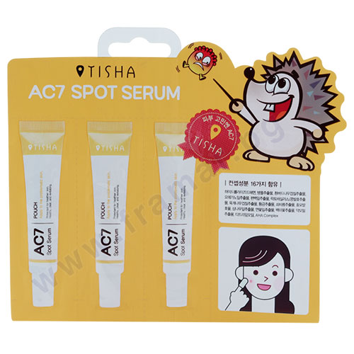Dr. Tisha AC7 е гел серум, който подобрява състоянието на кожата с акне, белези и зачервявания по лицето. Възстановява и подобрява състоянието й. Съставките в серума повлияват проблемната зона до 7 дни. Анти-Акне серумът съдържа 11 основни съставки, които подпомагат състоянието на кожата. Патентованата съставка Dryopteris Filix-Mas Root Extract № 10-0780666 изсветлява и изглажда кожата.