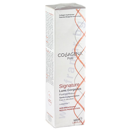 Флуидът COLLAGENA Pure Lumi Gorgeous изсветлява пигментните петна, тушира несъвършенствата по кожата и изравнява тена. Съдържа патентован, дефрагментиран Български колаген с натурален произход. Таргетираният комплекс Lumisphere™ има доказано редуциращо действие върху меланиновия индекс, веднага след нанасяне, и в дългосрочен план при продължителна употреба. Съчетание от ценни витамини и масла, допринася за допълнителна мекота, свежест и здравословно сияние.