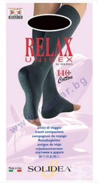 Solidea Relax Unisex са 3/4 чорапи с компресия, притежаващи мека еластична лента, която поддържа чорапа, но не оказва натиск върху крака. Произведени са с най-новите прежди, по последна технология. Плетката им е изключително еластична, допринася за удобство при носене през целия ден. Чорапите имат градуирана компресия от 18/21 mmHg, която се препоръчва при варикозни и разширени вени, големи отоци и е особено подходяща при възстановяване след склеротерапия и варицектомия. Елегантни и леки, те са подходящи за всякакви случаи. Имат антистрес стъпало, изработено от бактериостатична прежда, с допълнително антимикробно третиране Sanitized.