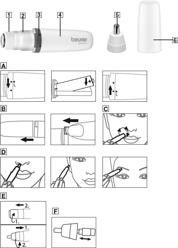 4. За да премахнете космите в ушите и ноздрите си и за да оформите веждите си, включете приставката по показания начин на картина Е.