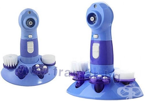 Масажор за лице с приставки, които по различен начин третират акнето - четка за пилинг на лице, масажиращ накрайник, гъба за измиване и всмукателна чашка. Пулверизаторът може да се напълни с вода или тонизиращ продукт.