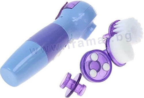 - 4 сменяеми глави: гъба за измиване и масажиране, четка за пилинг на лице, масажиращ накрайник и глава всмукателна чашка