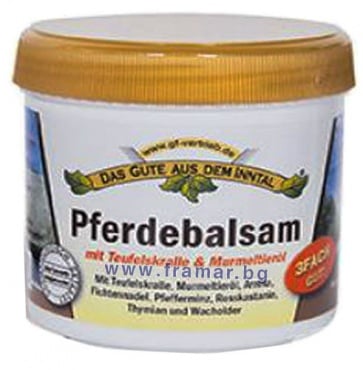 С дяволски нокът, мас от мармот, арник, иглички от смърч, мента, конски кестен, мащерка и хвойна. Този конски балсам съдържа не само дяволски нокът, но и висококачествена, истинска мас от мармот.