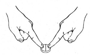 Поставете таблетката върху твърда, плоска повърхност (като маса или плот) с делителната линия нагоре. Натиснете за кратко и силно с двата показалеца (или палеца) върху краищата на таблетката в ляво и дясно от делителната линия.