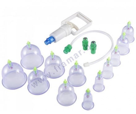 Китайски вендузи за здраве на тялото - отлична терапия и здраве за кожата на тялото по един здравословен и популярен китайски метод. Терапията с комплекта вендузи подобрява състоянието на кожата и има антицелулитен ефект. Комплектът включва 12 вендузи, помпа и 6 магнитни накрайника.