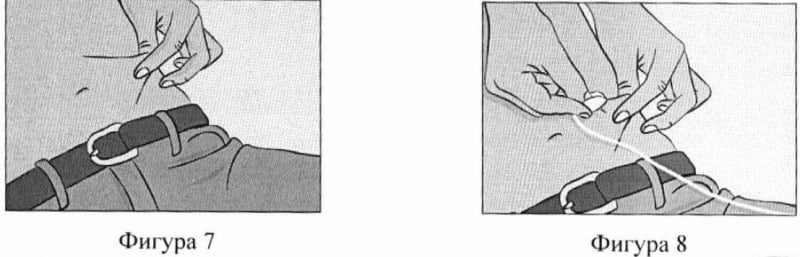 - Защипете кожа между палеца и показалеца около мястото на инжектиране (Фигура 7), внимателно свалете капака на иглата и поставете иглата в кожата (Фигура 8). Ъгълът на въвеждане на иглата ще зависи от вида на използвания набор за инфузия.
