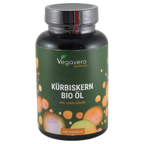 Kürbiskernöl Bio на немската марка VegaVero съдържа висококачествено масло от тиквени семки, произведено чрез студено пресоване и стандартизирано до 45% линолова киселина. Продуктът е 100% органичен и веган, създаден от тиквени семки (Cucurbita pepo), отглеждани без използване на синтетични торове и пестициди.