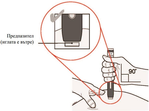 Продължавайте да държите опънатата/захванатата кожа. След като вече сте махнали капачката, поставете предпазителя на писалката върху кожата под ъгъл 90 градуса. Иглата е вътре в предпазителя.