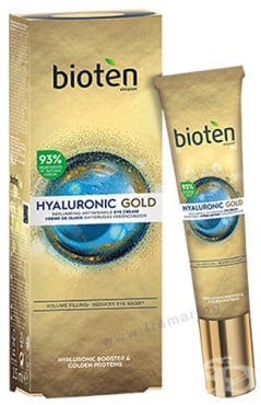 HYALURONIC GOLD Óïëúòíÿâàù îêîëîî÷åí êðåì ïðîòèâ áðú÷êè ñ 93% ñúñòàâêè ñ íàòóðàëåí ïðîèçõîä, îñèãóðÿâà ïúëíà ïðîòèâîáðú÷êîâà ãðèæà çà ðàçêðèâàíå åñòåñòâåíàòà ìëàäîñò íà êîæàòà. HYALURONIC BOOSTER ïîïúëâà êîæàòà ïîñðåäñòâîì ñúäúðæàùèòå ñå 3 òèïà õèàëóðîíîâà êèñåëèíà è 9 ìëí.õèàëóðîíîâè êàïñóëè, à GOLDEN PROTEINS ñïîìàãà ñèíòåçà íà õèàëóðîíîâà êèñåëèíà, ïîïúëâà âèäèìèòå áðú÷êè è íàìàëÿâà òúìíèòå ïåòíà è çàãóáàòà íà ïèãìåíòè, ñâúðçàíè ñ âúçðàñòòà.