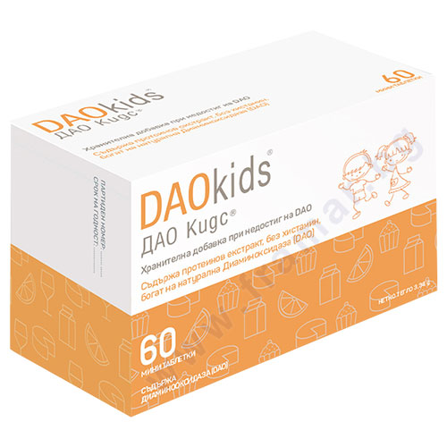 Хранителната добавка DAOKids® съдържа естествен протеинов екстракт, без хистамин, богат на ензима Диаминоксидаза (DAO), във вид на стомашно-устойчиви таблетки, с контролирано освобождаване на DAO в червата, устойчиви на киселинното рН в стомаха.