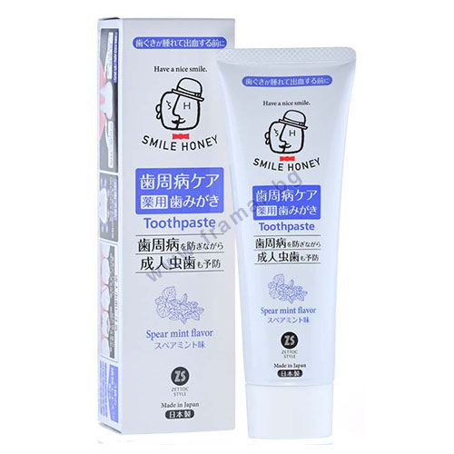 Паста за зъби Smile Honey Spear Mint - японска висококачествена паста за зъби с изразен и дълготраен дъх на мента за дентална грижа, подпомагаща венците. Съдържа натурални билкови и активни съставки, които разтварят зъбната плака. Благоприятства минерализацията и укрепването на зъбния емайл.