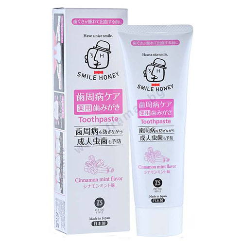 Паста за зъби Smile Honey Cinnamon Mint - японска висококачествена паста за зъби със свеж и дълготраен дъх на канела и мента за цялостна грижа на устната кухина. Съдържа натурални билкови и активни съставки, които подпомагат венците и разтварят зъбната плака. Благоприятства минерализацията и укрепването на зъбния емайл.