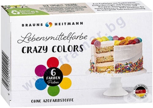 Crazy Colors - Сладкарска боя за сладкиши и напитки, 6 цвята - добре дозиращи се бои на прах за сладкиши и напитки в шест различни цвята: жълт, оранжев, червен, виолетов, син, зелен.