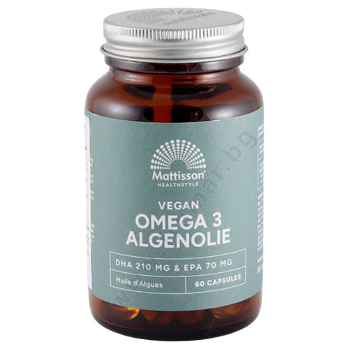 - Продуктът Mattisson HealthStyle Vegan Omega 3 Algae Oil DHA 210 mg & EPA 70 mg е хранителна добавка, създадена от масло от водорасли, което е източник на омега-3 мастните киселини EPA и DHA. Съдържанието на всяка веган капсула включва 600 mg масло от водорасли, от които 210 mg са DHA и 70 mg са EPA.