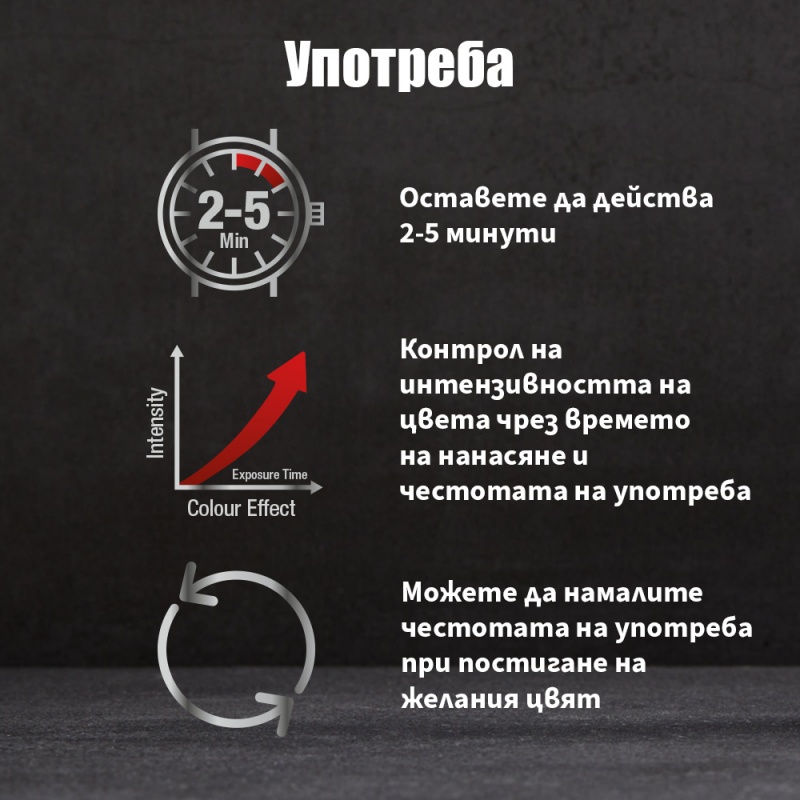 - Контролируема интензивност на цвета чрез продължителността на приложение и честотата на използване.
