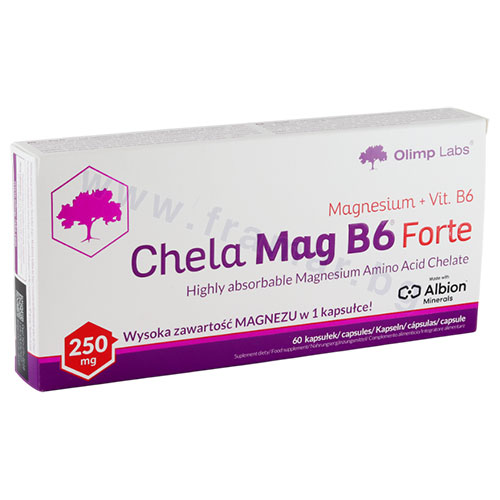 Olimp Чела-Маг В6® Форте съдържа лесно усвоима форма на магнезий – аминокиселинен хелат Albion. Всяка доза осигурява значително количество чисти магнезиеви йони, което отговаря на дневните нужди на организма от този минерал. Високото съдържание на магнезий е допълнено с витамин В6, който допринася за по-добрата му абсорбция и подсилва действието му.