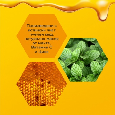 Захароза, течна глюкоза, мед (15%), витамин С (натриев аскорбат), масло от мента (menthae piperitae aetheroleum, 0,38%), цинк (цинков глюконат).