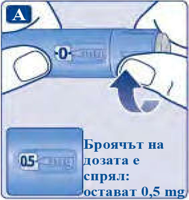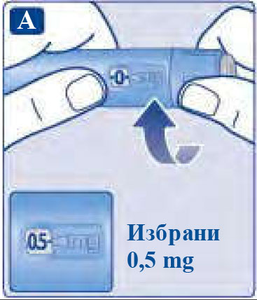| Само броячът и стрелката на дозата ще покажат, че са набрани 0,5 mg. Можете да избирате само 0,5 mg на доза. Когато писалката съдържа по-малко от 0,5 mg, броячът на дозата спира преди да се покаже 0,5. Селекторът на дозата прищраква различно, когато се завърти напред, назад или при преминаване на 0,5 mg. Не бройте прищракванията на писалката. Не бройте прищракванията на писалката. Със селектора на дозата трябва да се избират само дози по 0,5 mg. 0,5 mg трябва точно да се изравни със стрелката, за да сте сигурни, че приемате правилна доза. |