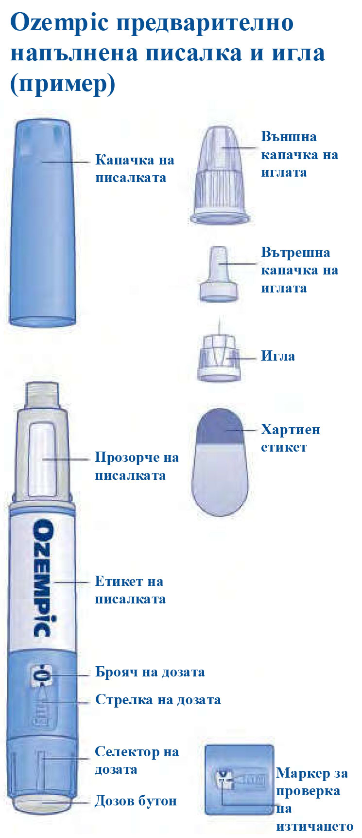 | Моля, прочетете внимателно тези указания, преди да използвате своята предварително напълнена писалка Ozempic. Говорете с Вашия лекар, медицинска сестра или фармацевт за това как да инжектирате Ozempic правилно. Започнете с проверка на писалката, за да сте сигурни, че тя съдържа Ozempic 0,5 mg, след което погледнете илюстрациите по-долу, за да се запознаете с различните части на писалката и иглата си. Ако сте сляп или имате лошо зрение и не можете да разчетете брояча на дозата върху писалката, не използвайте тази писалка без чужда помощ. Потърсете помощ от лице с добро зрение, което знае как да използва предварително напълнената писалка Ozempic. Вашата писалка е предварително напълнена и има възможност за набиране на дозата. Тя съдържа 2 mg семаглутид и можете да избирате само дози по 0,5 mg. Една неизползвана писалка съдържа четири дози по 0,5 mg. Използвайте таблицата от вътрешната страна на капака на картонената кутия, за да следите колко инжекции сте приложили и кога сте ги приложили. Писалката Ви е предназначена да се използва с игли за еднократна употреба 30G, 31G и 32G с дължина до 8 mm. В опаковката са включени игли NovoFine Plus. Моля, обърнете внимание: Вашата писалка може да се различава по размер от писалката, показана на картинката. Тези указания се отнасят за всички писалки Ozempic 0,5 mg. |