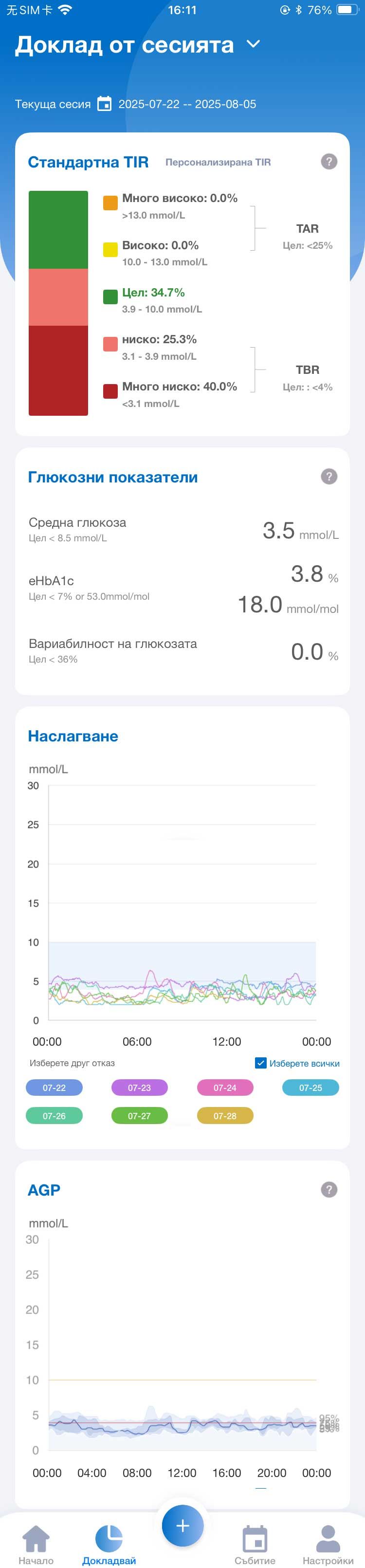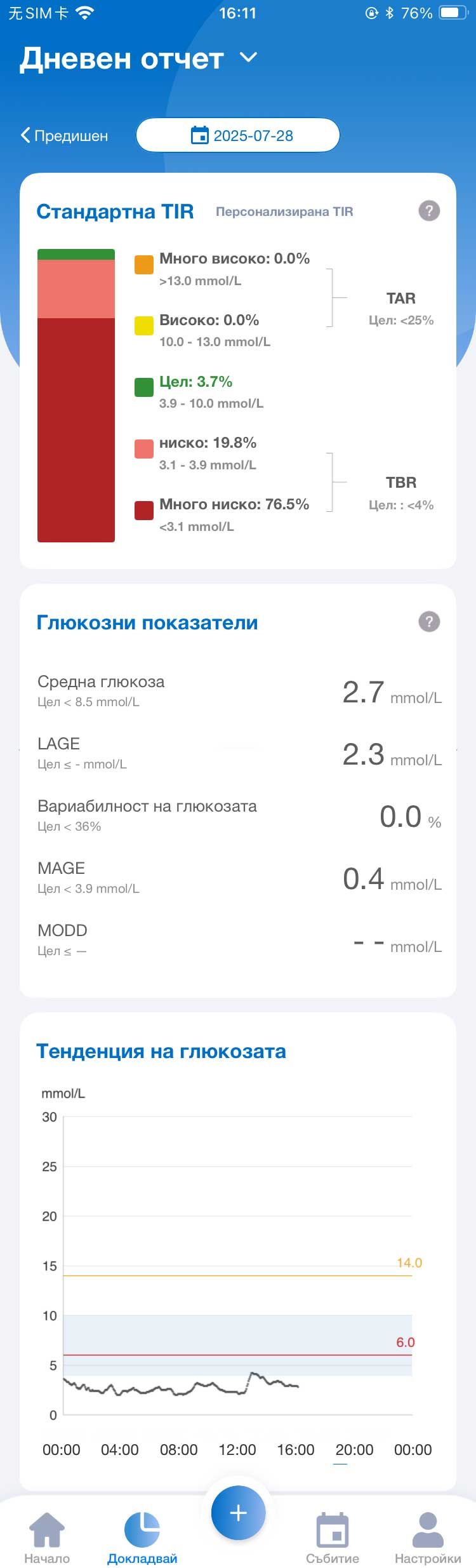 Целеви диапазон на глюкозата | Препоръчителен целеви диапазон (зелената зона): 3.9–10.0 ммол/л, според международните медицински стандарти. |