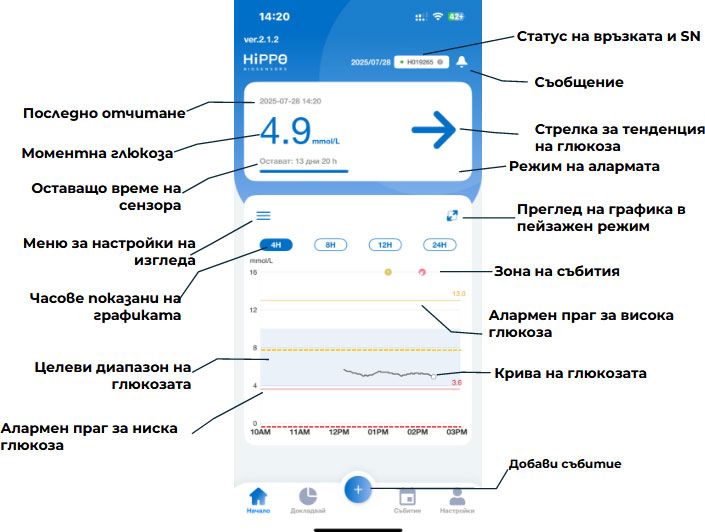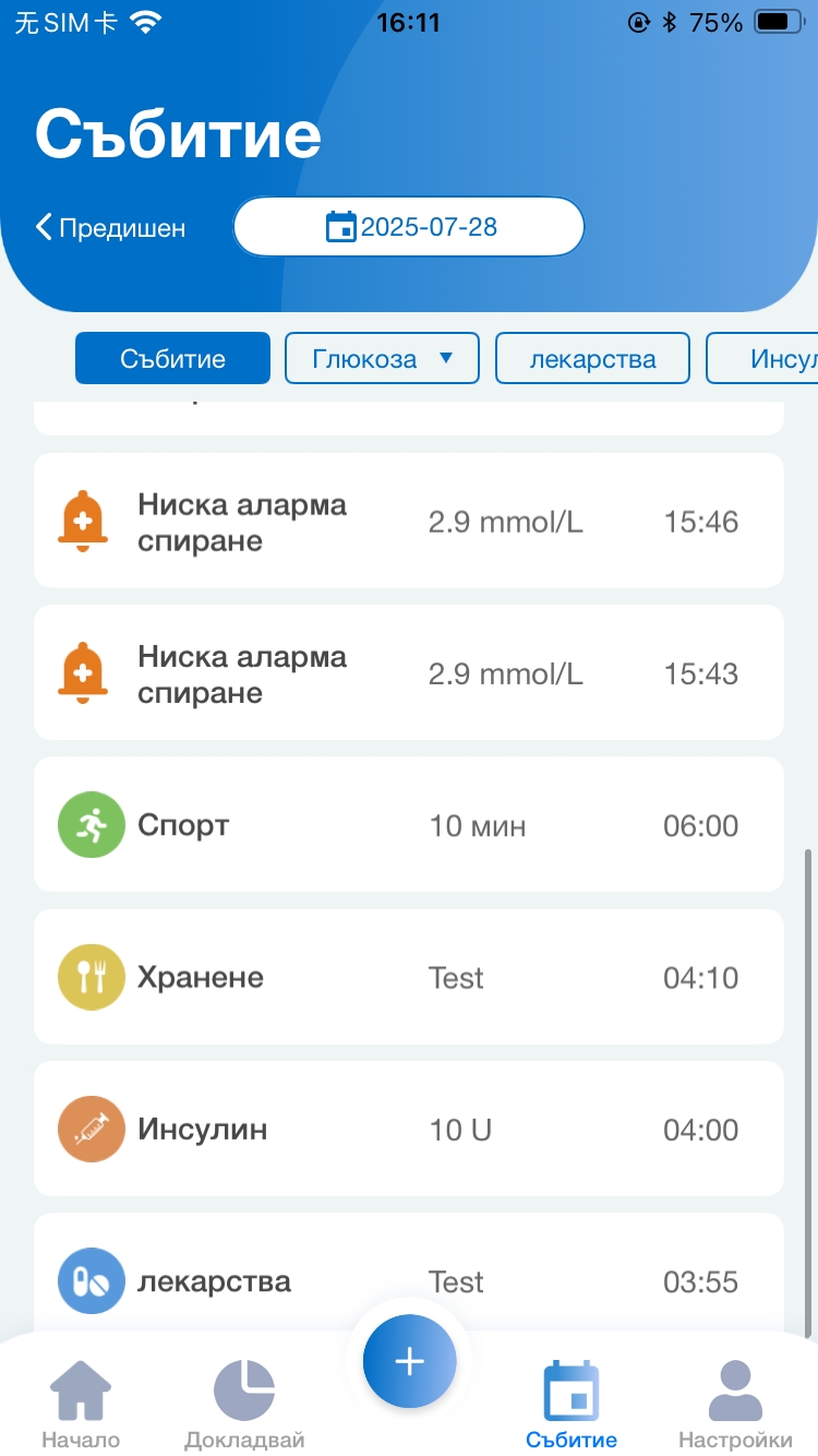 Събития | Добавяне и преглед на събития, свързани с мониторинга на глюкозата. |