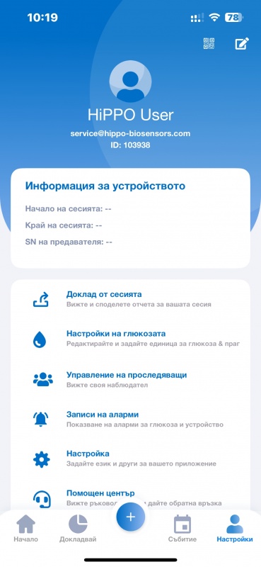СЕНЗОР HIPPO H1 - ЗА ИЗМЕРВАНЕ НА КРЪВНА ЗАХАР е свързан към
