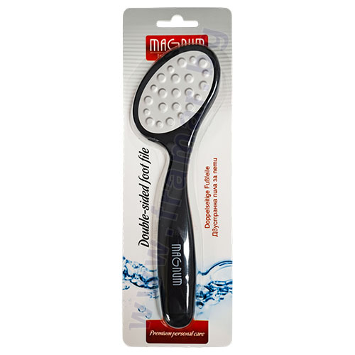 Двустранна пила за пети 22 см е предназначена за отстраняване на мазоли или загрубяла кожа на петите. Абразивната повърхност на пилата, изработена от неръждаема стомана, е устойчива на вода и двустранна. По-грубата страна е подходяща за зони, които изискват по-интензивно третиране, а по-фината – за изглаждане на кожата. Дългата дръжка Ви помага да достигате по-удобно краката си, а ергономичната й форма и меко покритие предотвратяват изплъзването при ползване.