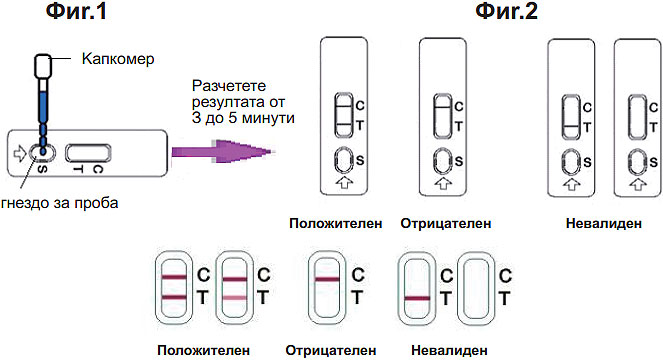 Невалиден: Резултатът е невалиден, ако не се появи червена линия в контролната област (C), дори ако линия се появи в тестовата област (T). Във всеки случай повторете теста. Ако проблемът продължава, незабавно прекратете използването на партидата и се свържете с вашия местен дистрибутор.