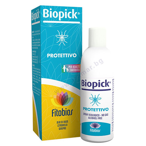 Спреят Biopick Protettivo от италианския бранд Fitobios е продукт, създаден на базата на растителни екстракти като масло от нийм, цитронела, хвойна и здравец, предназначен за отблъскване на насекоми като комари и кърлежи. Комбинацията от тези съставки осигурява естествена защита и е подходяща за възрастни и деца.