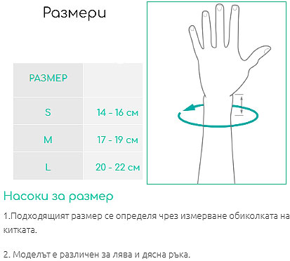 Подходящият размер се определя чрез измерване обиколката на китката. Продуктът се предлага в три размера за лява и три за дясна ръка. Таблица с размерите ще откриете на опаковката на продукта.