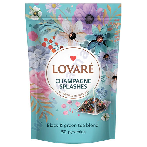 Чай в Пирамиди LOVARE Champagne Splashes създава дъга от щастливи моменти. Дълбока, силна и богата на вкус напитка. Уникалната ягодова композиция с метличина и аромат на горски ягоди, придава луксозен, празничен вкус.