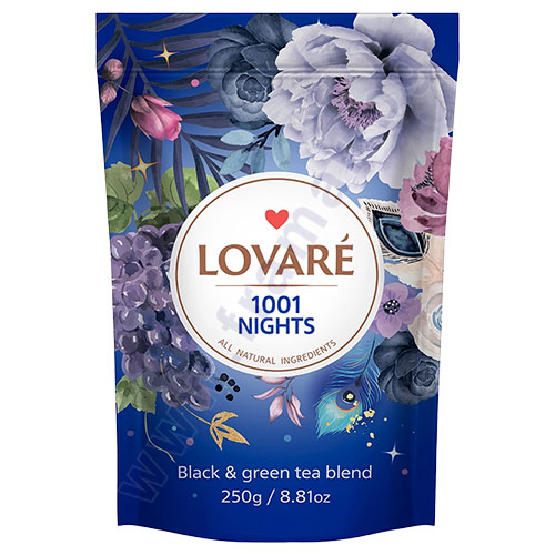 Чай Насипен LOVARE 1001 Nights е перфектна комбинация от тонизиращата сила на черен и зелен чай, енергията на сочна ябълка, нежността на цветни листенца вълшебни розови пъпки и кадифен гроздов акорд.