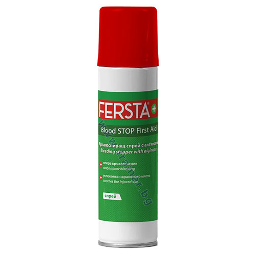 Кръвоспиращ спрей с алгинати, медицинско изделие. Fersta® Blood STOP First Aid се използва за спиране на кръвотечение при малки повърхностни рани. Активната съставка от алгинати образува прахообразен слой върху раната. Този слой абсорбира кръвта от областта на раната, като същевременно се образува охлаждащ хидрогел. Хидрогелът предпазва и успокоява травмираната област и способства за естествен процес на заздравяване.