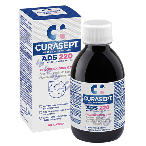 Curasept ADS DNA 220 вода за уста с хлорхексидин 0,20% за интензивна грижа при чувствителни венци, често кървене, подуване и възпаления в устната кухина. Препоръчва се след хирургични дентални процедури, поставяне на импланти, екстракции, както и при носене на протези и ортодонтски апарати. Образува защитен филм, овлажнява и облекчава раздразнението, без да причинява парене (без алкохол). Системата ADS не позволява оцветяване на зъбите и промяна във вкуса. Силна хидратация и локално антисептично действие.