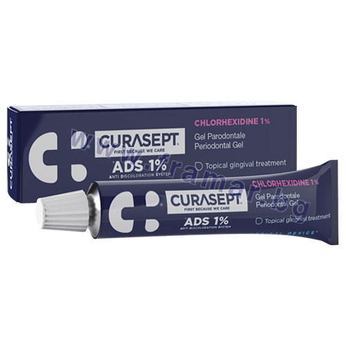 Curasept ADS gel 1% - пародонтален гел с хлорхексидин 1% и ADS система против оцветяване – локално терапия за венци при дентално лечение, импланти, пародонтални заболявания, протези и ортодонтски апарати. Образува защитен филм, подпомага облекчаване на раздразнението и предотвратява образуването на плака.