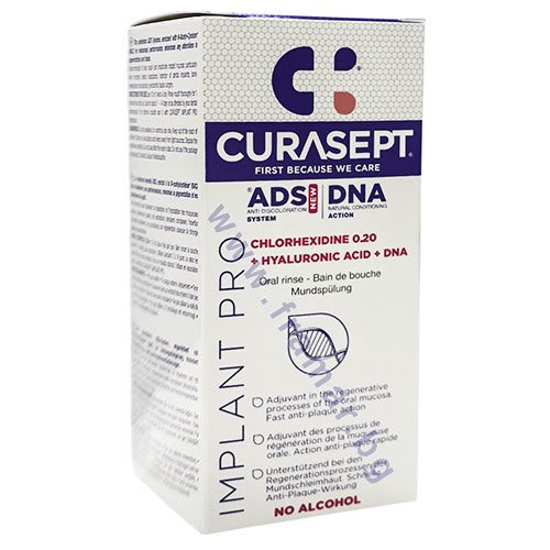 Curasept ADS DNA Implant PRO вода за уста с хлорхексидин 0,20%, ADS система против оцветяване и хиалуронова киселина. Подпомага регенерацията и овлажняването на лигавицата, особено след сложни стоматологични процедури, костна регенерация и пародонтална хирургия. Има бързо антиплаково действие. Без алкохол. Система ADS-NAC минимизира всякакви форми на обезцветяване и промени във вкуса.