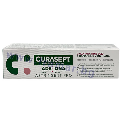 Curasept ADS DNA Astringent PRO паста за зъби с хлорхексидин 0.20%, хамамелис и ADS система против оцветяване. Подходяща при раздразнение на венците и лигавицата на устната кухина – включително от храна, ортодонтски апарати.