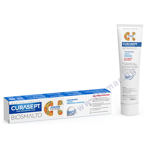 ПАСТА ЗА ЗЪБИ КЮРАСЕПТ BIOSMALTO ДЖУНИЪР ТУТИ ФРУТИ 75 мл 7 - 12 г е свързан към