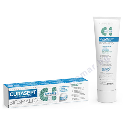 ПАСТА ЗА ЗЪБИ КЮРАСЕПТ BIOSMALTO БЕЙБИ КИД МЕНТА 50 мл 6 м - 6 г е свързан към