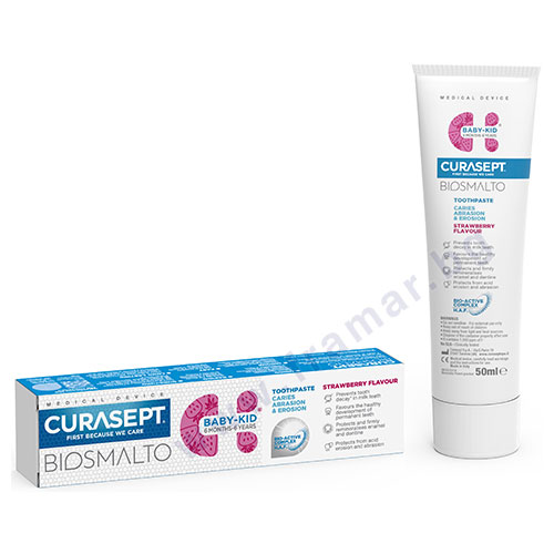 ПАСТА ЗА ЗЪБИ КЮРАСЕПТ BIOSMALTO БЕЙБИ КИД ЯГОДА 50 мл 6 м - 6 г е свързан към