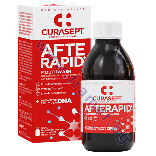 Curasept AFTE Rapid+ вода за уста с иновативна формула с хиалуронова киселина и растителни екстракти. Облекчава болката и подпомага бързото възстановяване при афти, вирусни и гъбични инфекции, херпес, бактериални възпаления, автоимунни лезии като пемфигус, булозен пемфигоид и еритема мултиформе. Подходяща при множество лезии и хронични възпаления.