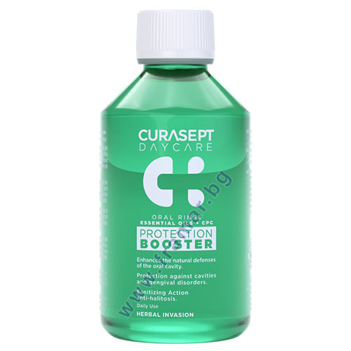 Curasept Booster Herbal Invasion вода за уста с вкус на билки – Подсилва естествените защитни механизми в устната кухина. Има почистващ и освежаващ ефект и се бори с лошия дъх. Подходяща за ежедневна употреба. Формулата комбинира действието на етерични масла с цетилпиридиниев хлорид (CPC), който възпрепятства размножаването на микроорганизми в устната кухина.