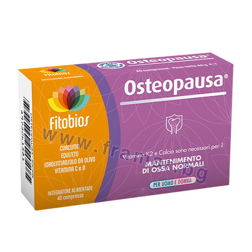 Остеопауза е хранителна добавка, създадена за поддържане на нормалното състояние на костите и зъбите – фактор от особено значение в периода на менопауза. Формулата представлява внимателно подбран комплекс от основни хранителни вещества, включващ Калций, Витамини D3, K2 и C, както и растителни екстракти от Полски хвощ, Маслина и Куркума.