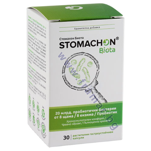 STOMACHON BIOTA е хранителна добавка под формата на стомашно-устойчиви растителни капсули, която обединява в балансирана комбинация пробиотик, пребиотични FOS (разтворими фибри) и храносмилателни ензими.