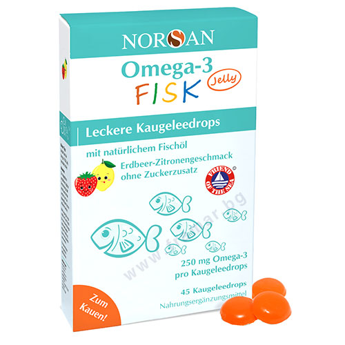 Желираните дъвчащи дражена NORSAN Омега-3 Фиск съдържат натурално рибено масло (богато на Ейкозапентаенова и Докозахексаенова киселина) от устойчив улов на диви екземпляри, с вкус на ягода и лимон и без добавена захар са подходящи за деца, подрастващи и възрастни.