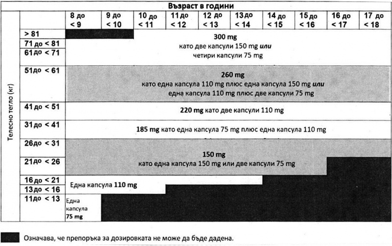 Препоръчителната доза е 300 mg, приети като една капсула от 150 mg два пъти дневно.