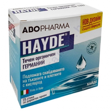 HAYDE е иновативна формула на разтвор на органичен ГЕРМАНИЙ (Ge 132) в деминерализирана вода, която гарантира бърза и ефективна абсорбция, с добавен екстракт от гъба Рейши (Ganoderma lucidum, P. Karst). ГЕРМАНИЯТ се извлича от спороносната част от гъба Рейши (Ganoderma lucidum, P. Karst). Поради използването на рафинирани зърно и зърнени храни в ежедневната диета, количеството на приетия с храната германий е недостатъчно. HAYDE обогатява ежедневната диета с необходимото количество ГЕРМАНИЙ. ГЕРМАНИЯТ е важен елемент за баланса на много клетъчни функции. Допринася за протичането на окислителните процеси в клетката, като подпомага обогатяването на тъканите с кислород. Съдейства за нормализирането на еластичността и тонуса на кръвоносните съдове и спомага на организма за естественото изхвърляне на токсините извън тялото. Допринася за производството на енергия, за нормалното състояние на имунната и централната нервна системи. Повишава работоспособността и спомага възстановяването след тежки физически натоварвания.